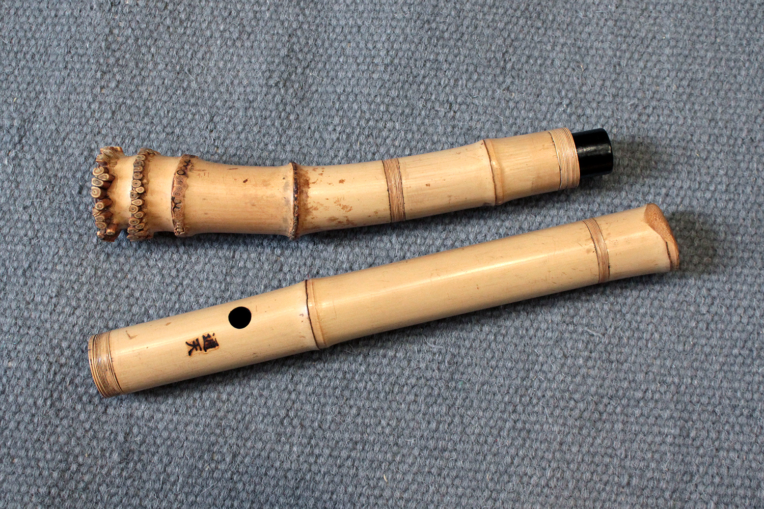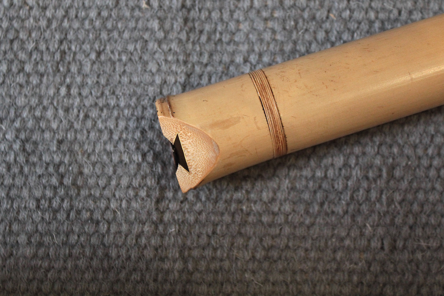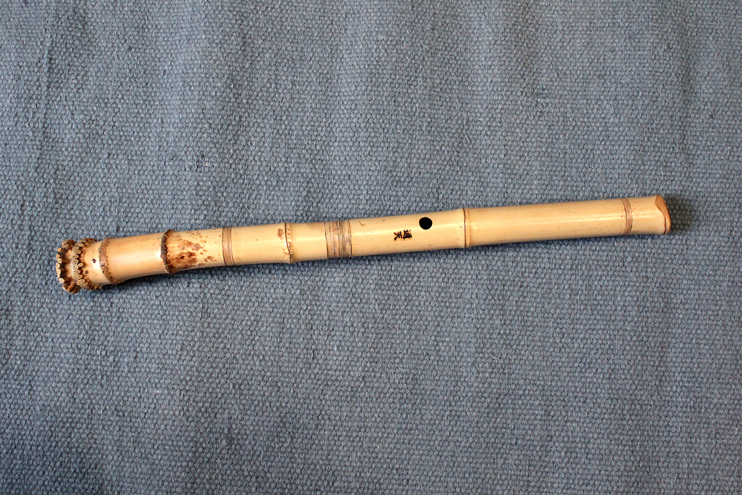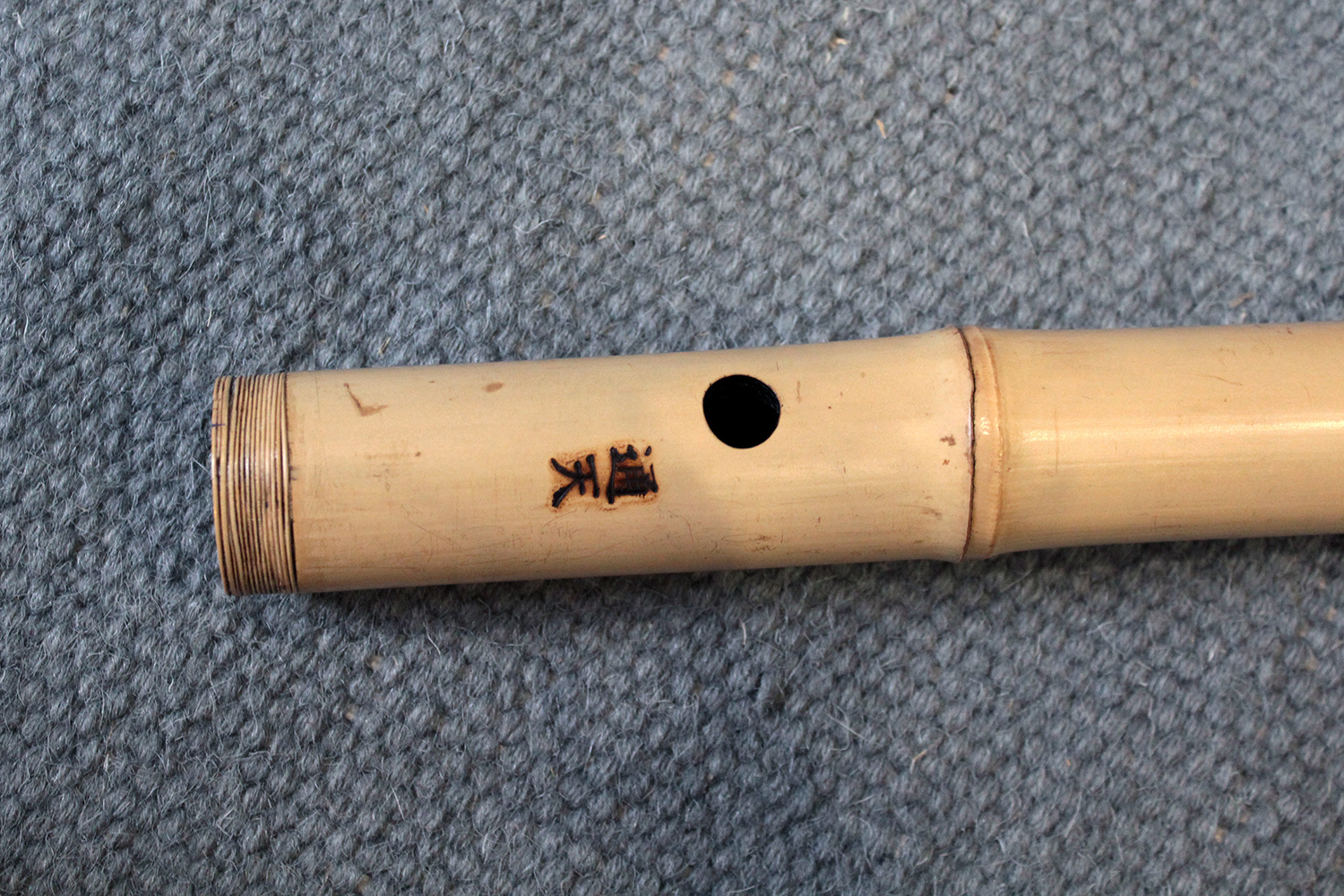 There are traditional rattan bindings on the middle joint and the bore is finished with black urushi. The bamboo was adjusted in two places to create ideal node spacings to place finger holes, then finished with rattan to blend into the bamboo. There are some superficial short fissures near the traditional root-end from the the bamboo straightening process. Those have been stable for many years. The bamboo is slightly oval and comfortable to hold as at 351 gram the flute is rather light.
