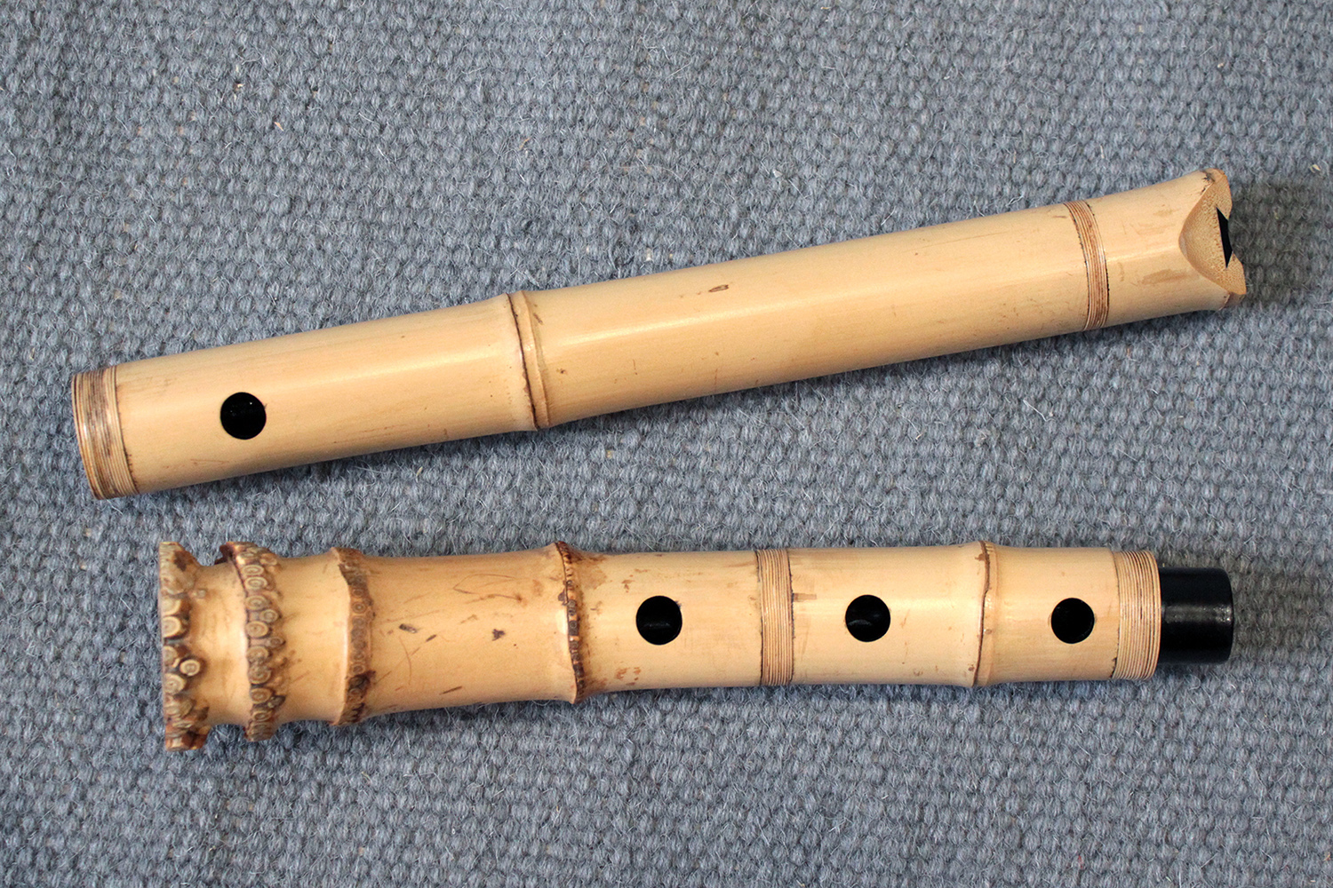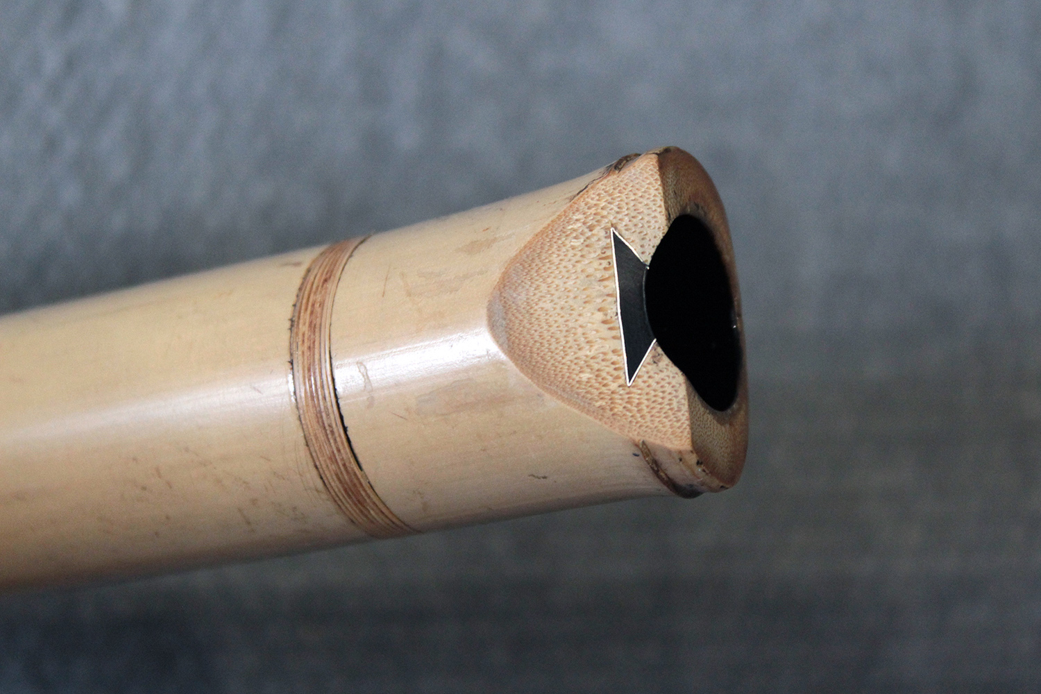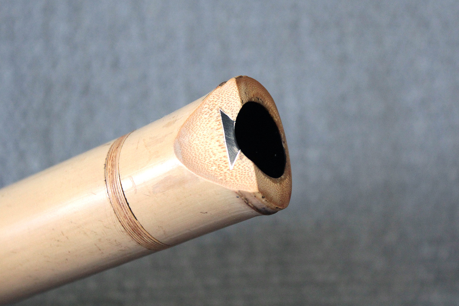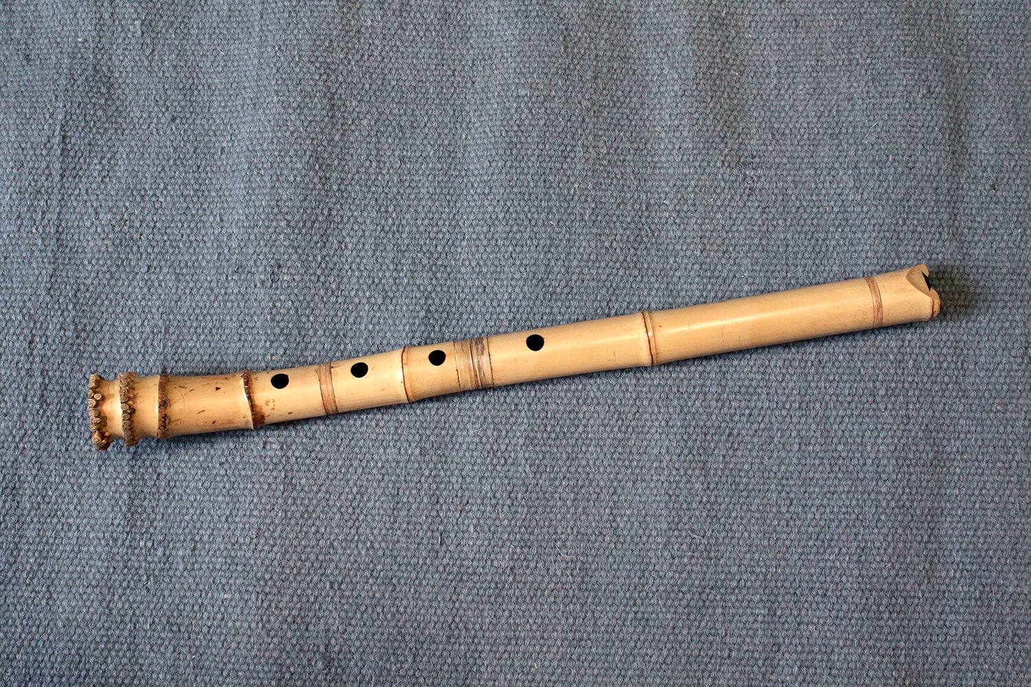 There are traditional rattan bindings on the middle joint and the bore is finished with black urushi. The bamboo was adjusted in two places to create ideal node spacings to place finger holes, then finished with rattan to blend into the bamboo. There are some superficial short fissures near the traditional root-end from the the bamboo straightening process. Those have been stable for many years. The bamboo is slightly oval and comfortable to hold as at 351 gram the flute is rather light.