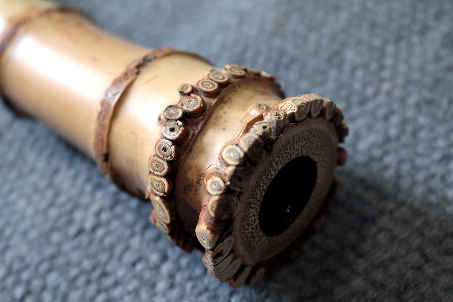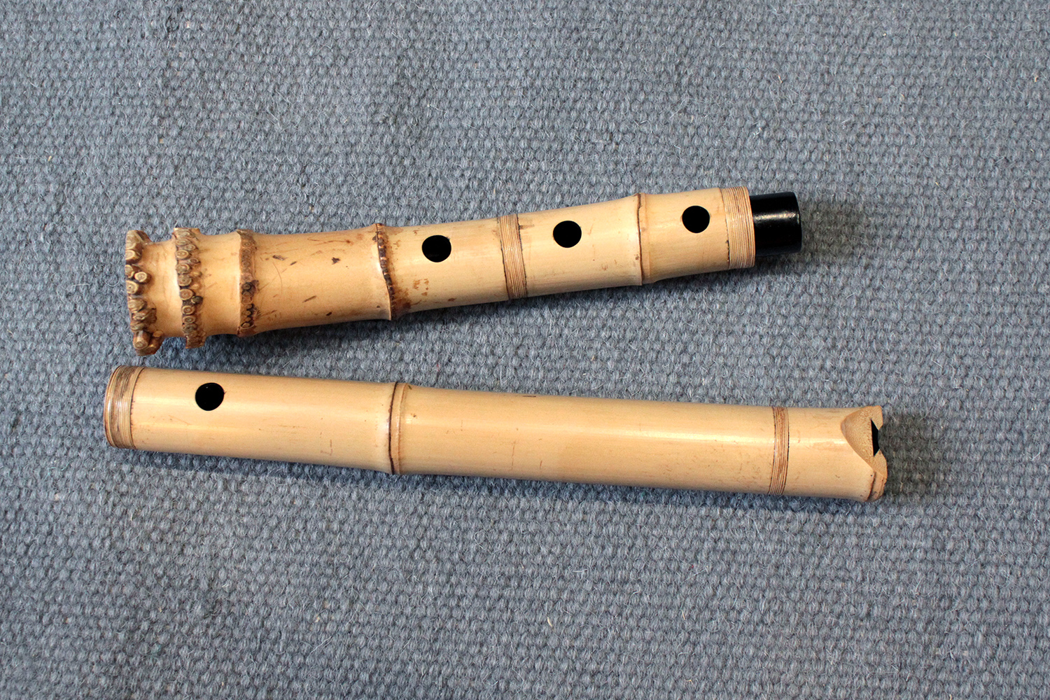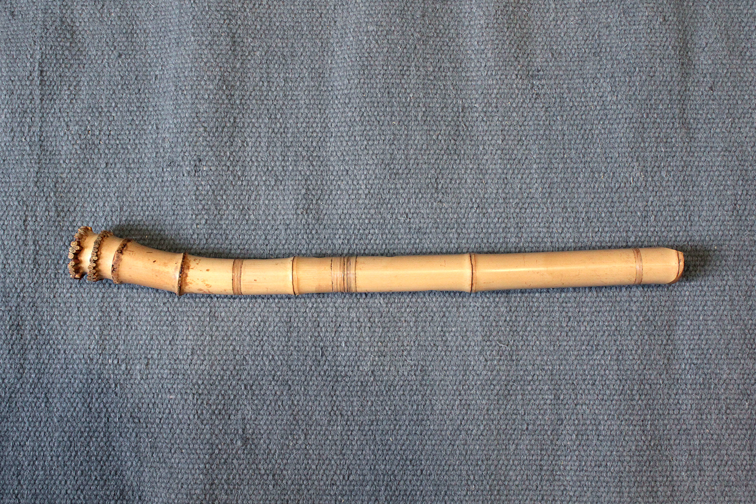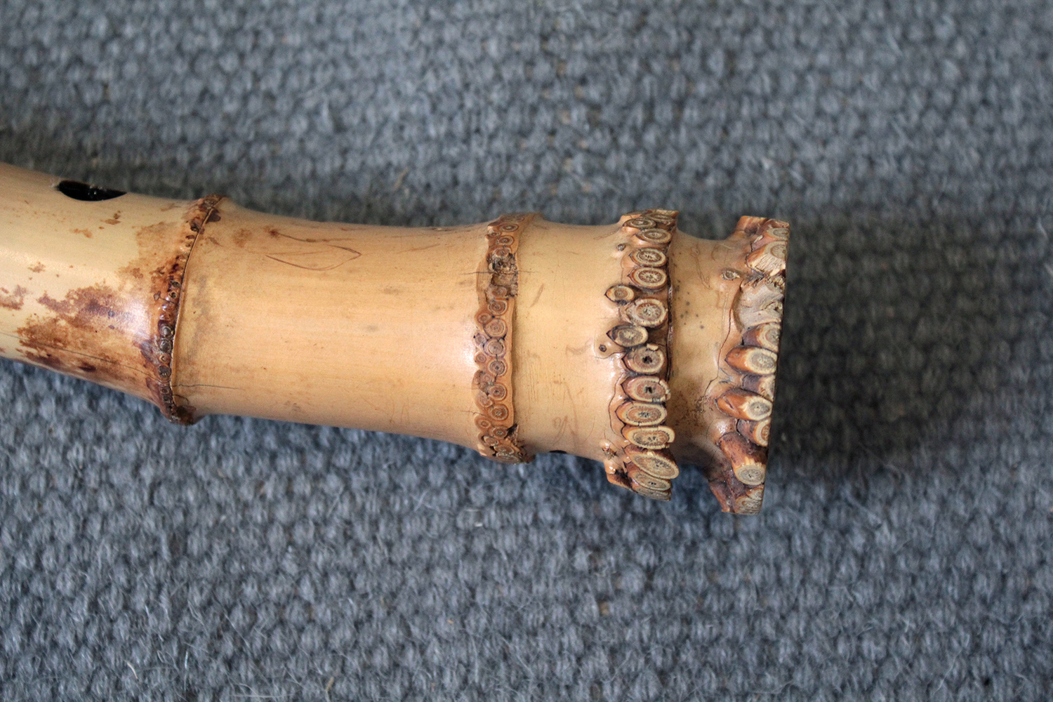 There are traditional rattan bindings on the middle joint and the bore is finished with black urushi. The bamboo was adjusted in two places to create ideal node spacings to place finger holes, then finished with rattan to blend into the bamboo. There are some superficial short fissures near the traditional root-end from the the bamboo straightening process. Those have been stable for many years. The bamboo is slightly oval and comfortable to hold as at 351 gram the flute is rather light.